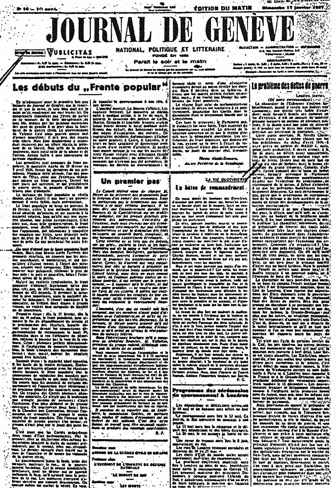 Pero dejemos a Niceto Alcalá-Zamora que, siendo presidente de la República, a modo de editorial, escribió un largo artículo en el diario suizo Journal de Genéve, que ilustra estas letras, y que, reproducimos una pequeña parte del artículo. Tiene fecha 17 de enero de 1937. Dice Alcalá-Zamora: