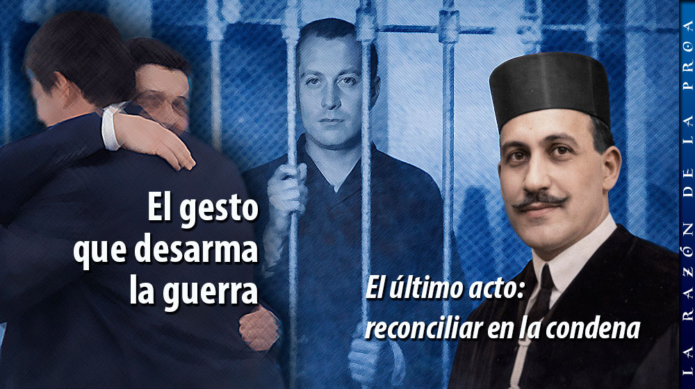 Frente a la falacia de quienes, a diario, flamean la reconciliación nacional y se obsesionan sañudamente en la condena de lo reconciliable, el abrazo de José Antonio es el primer monumento de la reconciliación de España. Antes, en el mes de agosto, se había ofrecido como mediador para terminar con la guerra [11]. En su informe, en el juicio de Alicante, explicó como de lo nacional y de lo sindicalista hacemos una síntesis capaz de superar las ideologías en conflicto [12]. E, inmediatamente después, cierra su testamento con la admirable invocación: ¡Ojalá fuera la mía la última sangre española que se vertiera en discordias civiles!.