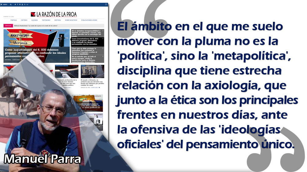El ámbito en el que me suelo mover con la pluma no es la 'política', sino la 'metapolítica', disciplina que tiene estrecha relación con la axiología, que junto a la ética son los principales frentes en nuestros días, ante la ofensiva de las 'ideologías oficiales' del pensamiento único.