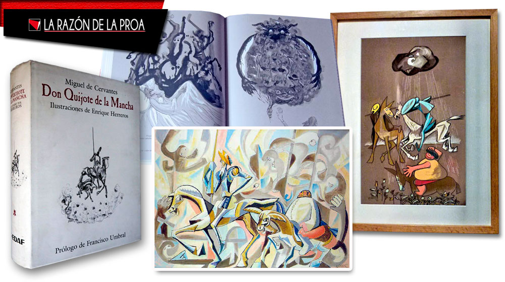 También, enamorado impenitente de El Quijote desde su infancia, coleccionó centenares de ediciones ilustradas de la vida del hidalgo con especial atención a las dibujadas por Gustavo Doré y realizó varias versiones ilustradas de la obra de Cervantes, una del tipo, digámoslo así, “codornicesco” y dos más, una de ellas a base de gouaches en un estilo cercano a Solana o Valdés Leal, pero acercándose también a Picasso en otra de ellas: “Enrique Herreros, aquel pintor genial de mediados de siglo, pariente por una parte de José Gutiérrez Solana y por la otra de Valdés Leal, tenía que llegar un día a concebir su Quijote ilustrado, donde las dueñas tienen picoteo de gallinas con gafas y el hidalgo está en su cama excesiva tratando de reunirse para encontrarse”, dijo Francisco Umbral describiendo la visión del texto de Cervantes que el mismo Umbral prologó.