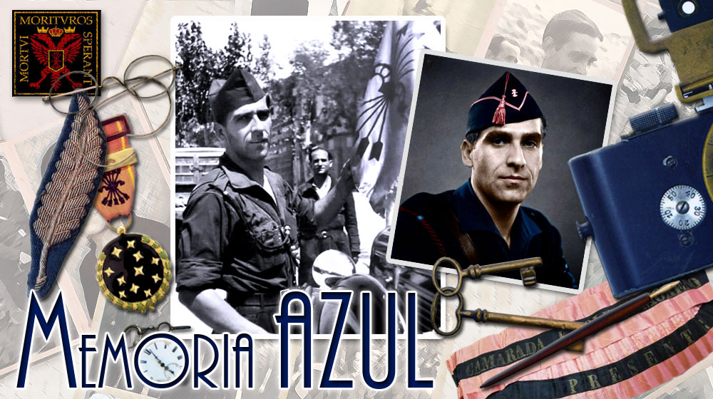Foto inédita de Pepe Sainz, en plena Guerra Civil, mostrando el guion de Mando de una centuria de Falange en un vehículo de una columna militar. Se observa que solo ostenta como emblema de su jerarquía los cordones rojinegros que José Antonio en persona le entregara en prueba de su puesto como consejero nacional y jefe provincial de la Falange de Toledo. Foto del archivo de los Guardianes de la Memoria Azul.