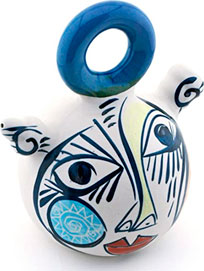 Ya nos gustaría enviar al chef José Andrés, con tan buena mensajera como la presidenta de la Comunidad de Madrid, un botijo de la planta del que hoy traemos a esta página, hecho y pintado a mano, con diseño cubista estilo picassiano, del alfar barcelonés de Art Escudellers, para que lo pusiera en la recepción del nuevo restaurante del hotel Ritz-Carlton. Pero este ejemplar es pieza única, y por otro lado Isabel Ayuso tendrá que llevar mucho equipaje para su ronda por Estados Unidos.