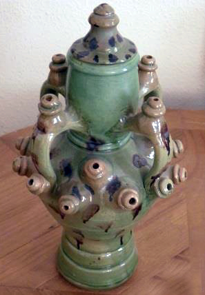 Ya decíamos que, aun siendo todos los botijos para lo mismo, se mantiene en cierta media la hechura a través de los siglos y los alfareros que se han ocupado de su fabricación, cada artífice ha intentado dejar en algún momento de su historia una pieza singular que lo recordara, aunque se perdiera el nombre del autor. En este caso se encuentra el botijo que hoy nos acompaña como un «colega» imprescindible, fundamentalmente en verano. Aunque, lo confesamos: tiene veinte pitorros y habrá que buscar el adecuado para beber sin darnos un baño refrescante. ¿En qué pensaría el alfa-rero? Probablemente lo hizo para algún personaje que, como los políticos de hoy, enga-ñan a discreción. Con este engaño, a su vez, el ceramista probablemente quiso dar al personaje la misma medicina.