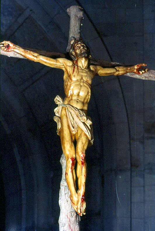 Nosotros lo haremos ante el Cristo que preside el altar de la Basílica del Valle de los Caídos, obra del escultor vasco, de Zumaya, Julio Beobide y policromado por Ignacio Zuloaga.